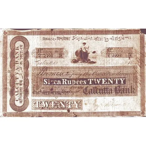 Promise to pay the bearer on demand Sicca Rupees Twenty For the Calcutta Bank. |