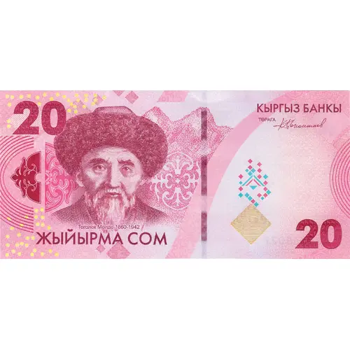 | Obverse lettering | 20 КЫРГЫЗ БАНКЫ ЖЫЙЫРМА СОМ 20 (Translation: Bank of Kyrgyzstan, Twenty Som) |