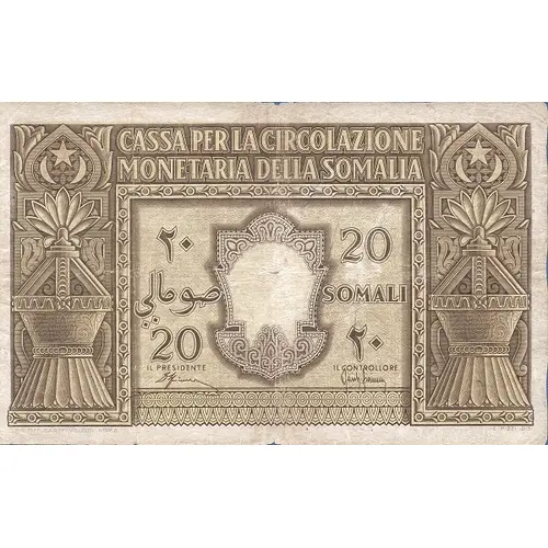 Obverse lettering CASSA PER LA CIRCOLAZIONE MONETARIA DELLA SOMALIA 20 SOMALI
