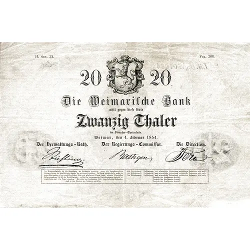 | نوشتههای روی اسکناس | 20 - 20 Die Weimarische Bank zahlt gegen diese Note Zwanzig Thaler im Vierzehn-Thalerfuße. Weimar, den 4. Februar 1854. Der Verwaltungs-Rath. Der Regierungs-Commissar. Die Direction. |
