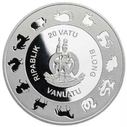 The obverse of the coin features the 12 signs of the Chinese Zodiac in an outside ring. In the center, the arms of Vanuatu featuring a Melanesian warrior standing in front of a curved boar`s tooth above a scroll reading `LONG GOD YUMI STANAP` and the value above. |