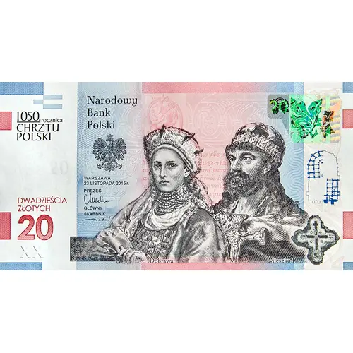 Double portrait of Duchess Dobrawa and Duke Mieszko I modeled after portraits by Jan Matejko. At Mieszko`s left arm, a representation of the Staurotheke of Ostrow Lednicka, a cross-shaped reliquary. |