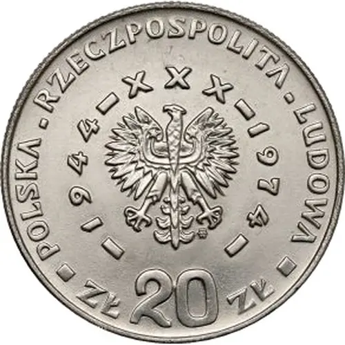 | Obverse lettering | POLSKA . RZECZPOSPOLITA . LUDOWA ▪ ZŁ 20 ZŁ ▪ - 1944 - XXX - 1974 - mw |