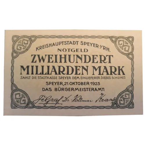 KREISHAUPTSTADT SPEYER a/RH. NOTGELD ZWEIHUNDERT MILLIARDEN MARK ZAHLT DIE STADTKASSE SPEYER DEM EINLIEFERER DIESES SCHEINES SPEYER, 21 OKTOBER 1923 DAS BÜRGERMEISTERAMT: (Translation: DISTRICT CAPITAL SPEYER ON THE RHINE EMERGENCY MONEY TWO HUNDRED BILLION MARKS WILL BE PAID BY THE CITY OF SPEYER TO THE DELIVERER OF THIS NOTE SPEYER, OCTOBER 21, 1923 THE MAYOR`S OFFICE:) |