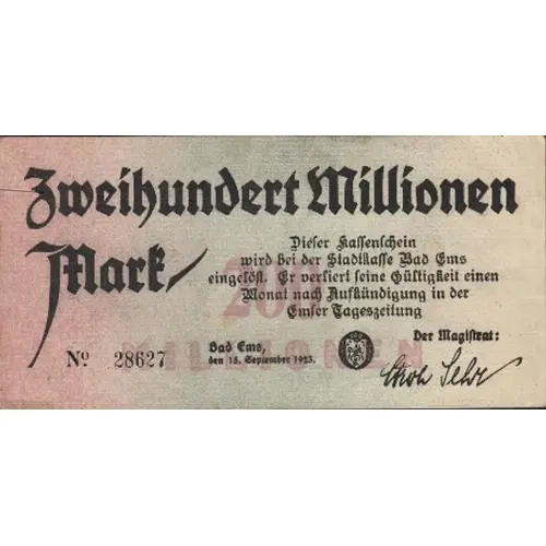 | Obverse description | Bad Ems (Hessen-Nassau) Stadt. Wmk: Linien-Streifen-Gitter |