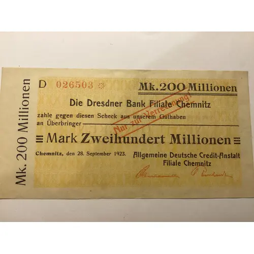 Obverse lettering Mk.200 Millionen(2) Die Dresdner Bank Filiale Chemnitz zahle gegen diesen Scheck aus unserem Guthaben an Überbringer MARK ZWEIHUNDERT MILLIONEN Chemnitz,den 28.September 1923 Allgemeine Deutsche Credit-Anstalt Filiale Chemnitz Nur zur Verrechnung!