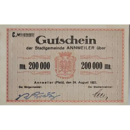 Gutschein der Stadtgemeinde Annweiler uber Mk 200000 200000 Mk Annweiler (Pflaz), den 24. August 1923 Der Burgermeister Der Stadteinnehmer (Translation: Voucher from the municipality of Annweiler via Mk 200000 200000 Mk Annweiler (Pflaz), August 24, 1923 The Mayor The City Collector) |