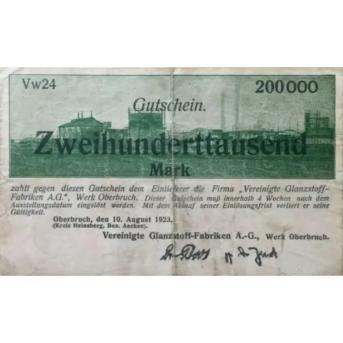 200000 Gutschein. Zweihunderttausend Mark zahlt gegen diesen Gutschein den Einlieferer die Firma `Vereinigte Glanzstoff-Fabriken A.G.`, Werk Oberbruch. Dieser Gutschein muß innerhalb 4 wochen nach dem Ausstellungsdatum eingelöst werden. Mit dem Ablauf seiner Einlösungsfrist verliert er seine Gültigkeit. Vereinigte Glanzstoff-Fabriken A.-G., Werk Oberbruch. (Translation: 200,000 Voucher. Two hundred thousand marks will be paid to the consignor in exchange for this voucher by the company `Vereinigte Glanzstoff-Fabriken A.G.`, Oberbruch plant. This voucher must be redeemed within four weeks of the date of issue. It expires upon expiration of the redemption period. Vereinigte Glanzstoff-Fabriken A.-G., Oberbruch plant.) |