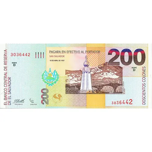 | Legenda awersu | EL BANCO CENTRAL DE RESERVA DE EL SALVADOR PAGARA EN EFECTIVO AL PORTADOR DOSCIENTOS COLONES MONUMENTO AL SALVADOR DEL MUNDO (Translation: The Central Reserve Bank of El Salvador will pay in cast to the bearer Two Hundred Colones. Monument to the Savior of the World) |