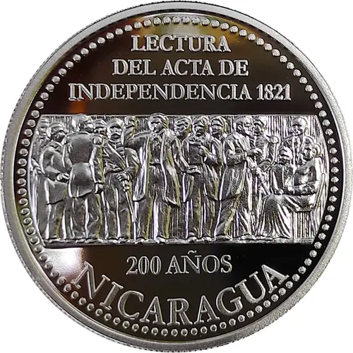 | Legenda do anverso | LECTURA DEL ACTA DE INDEPENDENCIA 1821 200 AÑOS NICARAGUA (Translation: Reading of the Act of Independence 1821 200 Years) |