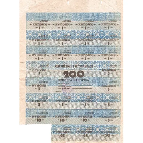 ЎЗБЕКИСТОН РЕСПУБЛИКАСИ 200 КУПОНГА КАРТОЧКА Ташкилот номи __________ Фамилияси __________ Ташкилот раҳбари __________ Бош бухгалтери __________ М. Ў. 1 квартал (Translation: Republic of Uzbekistan, 200 coupon cards, Name of organisation/Last name/Head of the organization/Chief Accountant, 1st quarter) |