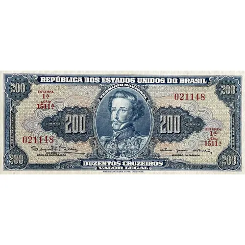 REPÚBLICA DOS ESTADOS ESTADOS UNIDOS DO BRASIL TESOURO NACIONAL 200 200 DUZENTOS CRUZEIROS DIRETOR CAIXA DE AMORTIZAÇÃO MINISTRO DA FAZENDA D.PEDRO I VALOR LEGAL AMERICAN BANK NOTE COMPANY. (Translation: Republic of United States of Brazil National Treasury 200 200 Two Hundred Cruzeiros Director of the Amortization Fund Finance Minister D.Pedro I Legal Amount American Bank Note Company.) |