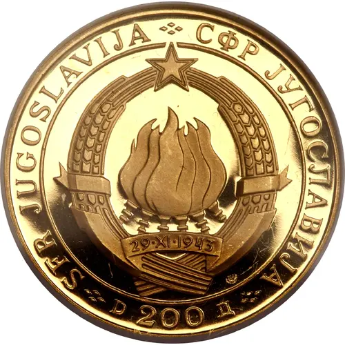 | Opschrift voorzijde | SFR JUGOSLAVIJA ❖ СФР ЈУГОСЛАВИЈА 29.XI.1943 ❖ D 200 Д ❖ (Translation: Socialist Federal Republic of Yugoslavia 200 Dinars) |