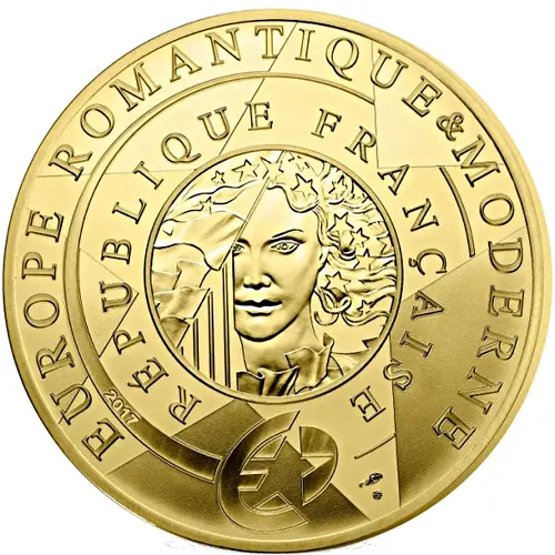 The reverse of the coin celebrates on one hand an iconic building of the technical evolution of that era: the Eiffel Tower; on the other hand an artist representative of the international influence of French literature, Victor Hugo. The famous romantic painting “Liberty leading the People` crowns the design. |