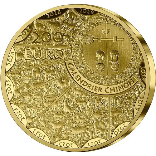 | Obverse lettering | RF 200 EURO CALENDRIER CHINOIS 2018 2019 2020 2021 2022 2023 2024 2025 2026 2027 2028 2029 |