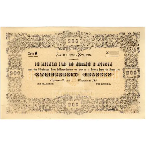 | نوشتههای روی اسکناس | 200 Serie A. No. Zahlungs-Schein. DIE LÄNDLICHE SPAR- UND LEIHKASSE IN APPENZELL yahlt dem Ueberbringer dieses Yahlungs-Scheins von heute an in dreissig Tagen den Betrag von ZWEIHUNDERT FRANKEN Appenzell, am Weimmonat 188 DER PRÄSIDENT: DER KASSIER: 200 |