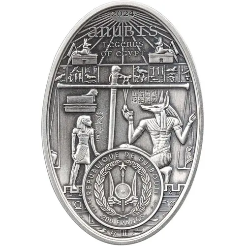 | 表面の銘文 | 2024 ANUBIS LEGENDS OF EGYPT REPUBLIQUE DE DJIBOUTI AG .999 3 OZ 200 FRANCS |