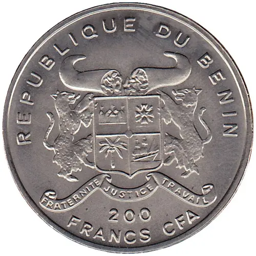 | Obverse lettering | REPUBLIQUE DU BENIN FRATERNITE JUSTICE TRAVAIL 200 FRANCS CFA |