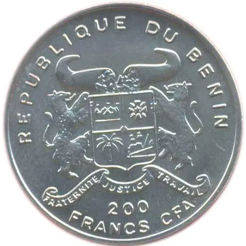 | Obverse lettering | REPUBLIQUE DU BENIN FRATERNITE JUSTICE TRAVAIL 200 FRANCS CFA |