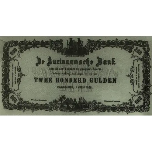De Surinaamsche Bank te Paramaribo betaald aan Tonder in gangbare Specie TWEE HONDERD GULDEN PARAMARIBO, 1 JULIJ 1865. (Translation: The Suriname Bank in Paramaribo Pay to bearer in current specie Two Hundred Gulden Paramaribo, July 1, 1865.) |