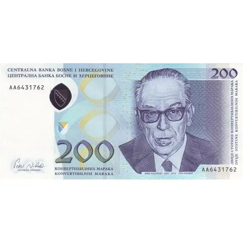 CENTRALNA BANKA BOSNE I HERCEGOVINE ЦЕНТРАЛНА БАНКА БОСНЕ И ХЕРЦЕГОВИНЕ 200 КОНВЕРТИБИЛНИХ МАРАКА KONVERTIBILNIH MARAKA 200 ДВИЈЕ СТОТИНЕ КОНВЕРТИБИЛНИХ МАРАКА DVIJE STOTINE KONVERTIBILNIH MARAKA ИВО АНДРИЋ 1892 – 1975 IVO ANDRIĆ |