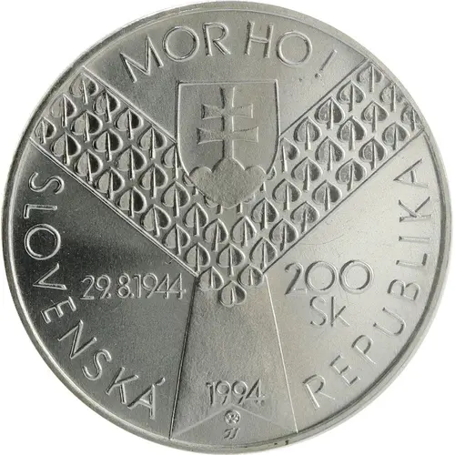 Obverse lettering MOR HO! (Plague Him!) Name and first verse of Janko Kráľ´s poem. (Poem against tyranny) 29.8.1944 200 Sk SLOVENSKÁ REPUBLIKA