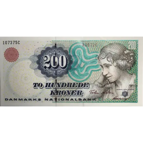 | Legenda do anverso | 200 200 TO HUNDREDE KRONER DANMARKS NATIONALBANK © (Translation: Two Hundred Kroner Denmarks National Bank) |