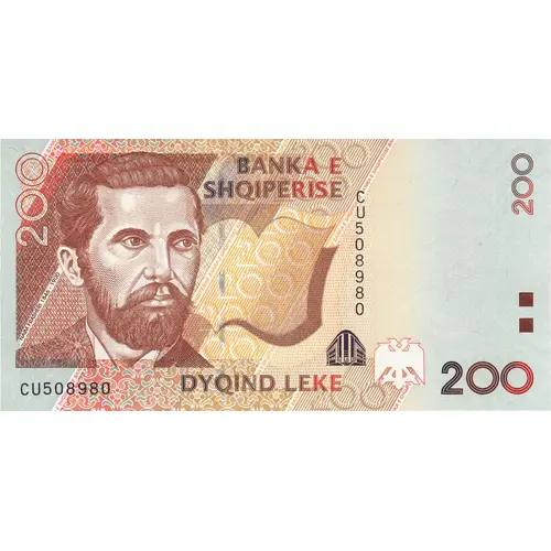 | Obverse lettering | BANKA E SHQIPERISE 200 DYQIND LEKE Translation: BANK OF ALBANIA 200 TWO HUNDRED LEKE (Translation: Bank of Albania 200 Two Hundred Leke) |