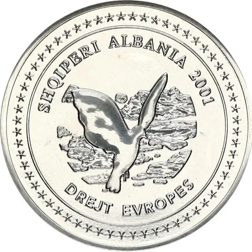 | Chữ khắc mặt trước | SHQIPERI ALBANIA 2001 DREJT EVROPES (Translation: Albania To Europe) |