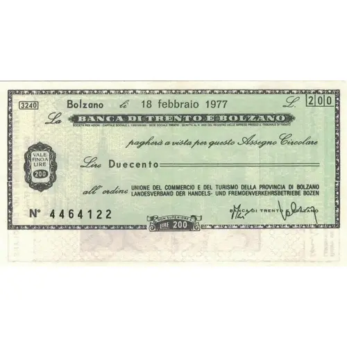 | نوشتههای روی اسکناس | Trento li L.200 La BANCA DI TRENTO E BOLZANO pagherà a vista per questo Assegno Circolare Lire Duecento all’ordine VALE FINO A LIRE 200 |