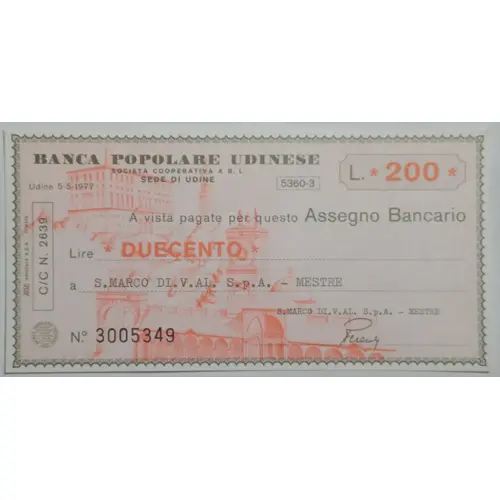 Légende de l’avers BANCA POPOLARE UDINESE SOCIETA COOPERATIVA A R.L. SEDE DI UDINE 5360-3 L. 200 Udine 5-5-1977 DUECENTO