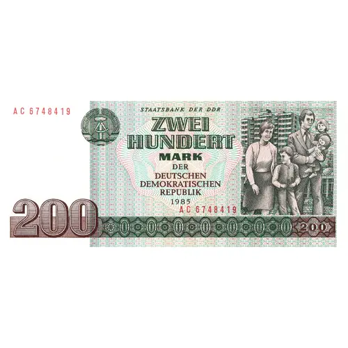 (Translation: STATE BANK OF THE GDR TWO HUNDRED MARKS THE GERMAN DEMOCRATIC REPUBLIC 1985)