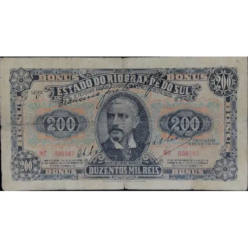 | Obverse lettering | BÔNUS ESTADO DO RIO GRANDE DO SUL SÉRIE F O TESOURO PAGARÁ AO PORTADOR A DOZE MEZES DESTA DATA 200 PORTO ALEGRE, 1º DE MAIO DE 1934 Julio de Castilhos DUZENTOS MIL RÉIS E JUROS DE 1% AO ANO. LEI Nº 523 DE 13 DE OUTUBRO DE 1930. DECRETOS: Nº 4603, DE 18 DE OUTUBRO DE 1931, Nº 4738 DE 16 DE MARÇO DE 1931, Nº4817 DE 26 DE JUNHO DE 1931, Nº4937 DE 15 DE FEVEREIRO DE 1932. Nº5279 DE 24 DE FEVEREIRO DE 1933 E Nº 5546 DE 13 DE MARÇO DE 1934. BÔNUS Lit. Da Livraria do Globo. Porto Alegre (Translation: Bonus State of the Rio Grande do Sul Series F Will pay the bearer, twelve months from this date, Two Hundred Thousand Reis and interest of 1% anually. Law No. 523 of October 13, 1930. Decrees: No. 4603 of October 18, 1931, No. 4738 of March 16, 1931, No. 4817 of June 26, 1931, No. 4937 of February 15, 1932,.No.5279 of February 24, 1933 and No.5546 of March 13, 1934.. Porto Alegre, May 1st, 1933) |