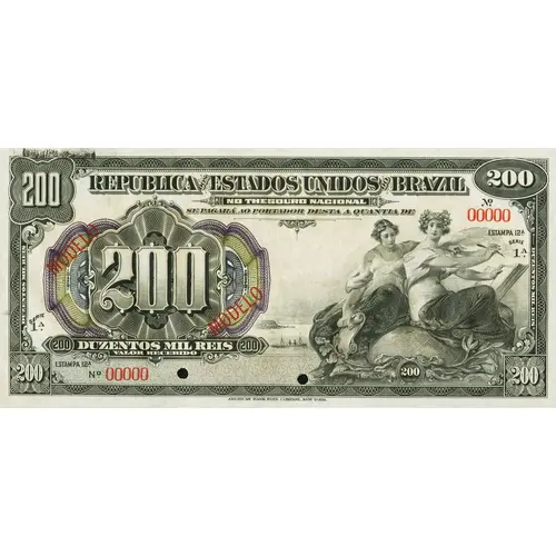 | Obverse lettering | 200 200 REPÚBLICA DOS ESTADOS UNIDOS DO BRAZIL NO THESOURO NACIONAL SE PAGARÁ AO PORTADOR DESTA A QUANTIA DE 200 200 DUZENTOS MIL RÉIS 200 VALOR RECEBIDO AMERICAN BANK NOTE COMPANY, NEW YORK (Translation: Republic of the United States of Brazil At the National Treasury the holder will be paid the amount of Two Hundred Thousand Reis Amount received American Bank Note Company, New York) |