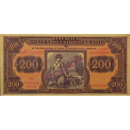 | Obverse lettering | 200 200 REPÚBLICA DOS ESTADOS UNIDOS DO BRASIL NO THESOURO NACIONAL SE PAGARÁ AO PORTADOR DESTA A QUANTIA DE 200 SPECIMEN 200 DUZENTOS MIL RÉIS VALOR RECEBIDO 200 200 (Translation: Republic of the United States of Brazil At the National Treasury the holder will be paid the amount of SPECIMEN Two Hundred Thousand Reis Amount received) |