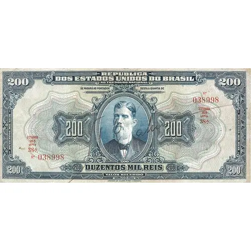 | Obverse lettering | REPUBLICA DOS ESTADOS UNIDOS DO BRAZIL NO THESOURO NACIONAL SE PAGARÁ AO PORTADOR DESTA A QUANTIA DE 200 200 200 200 DUZENTOS MIL REIS VALOR RECEBIDO 200 200 AMERICAN BANK NOTE COMPANY (Translation: Republic of the United States of Brazil In the National Treasury will be paid to the carrier of this amount of Two Hundred Thousand Réis Amount Received American Bank Note Company) |