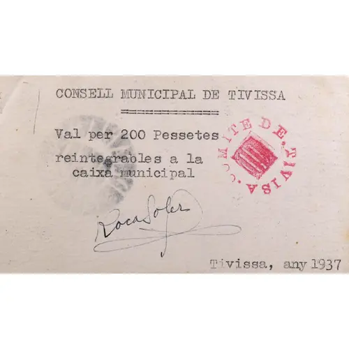 CONSELL MUNICIPAL DE TIVISSA Val per 200 Pessetes reintegrable a la caixa municipal Tivissa, any 1937 (Translation: Municipal Council of Tivissa Voucher for 200 Pesetas repayable to the municipal treasury Tivissa, year 1937) |