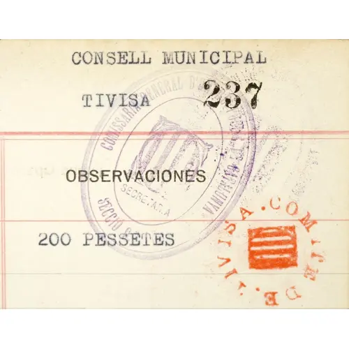 CONSELL MUNICIPAL TIVISA 200 PESSETES COMITE DE TIVISA (Translation: Municipal Council Tivisa 200 Pesetas Tivisa Committee) |