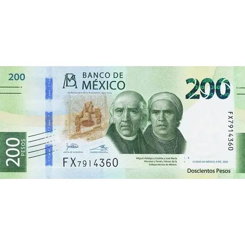 | Obverse lettering | BANCO DE MÉXICO 30 Aniversario de la Autonomía 1994–2024 CAMPANA DE DOLORES 200 PESOS JUNTA DE GOBIERNO CAJERO PRINCIPAL FX8914407 Miguel Hidalgo y Costilla y José María Morelos y Pavón, héroes de la Independencia de México CIUDAD DE MÉXICO, 6 DIC. 2023 Doscientos Pesos (Translation: Bank of Mexico 30th Anniversary of Autonomy 1994–2024 Dolores Bell 200 Pesos Governing Board, Main Cashier Miguel Hidalgo y Costilla and José María Morelos y Pavón, Heroes of the Independence of Mexico México City, December 9th., 2023 Two Hundred Pesos) |