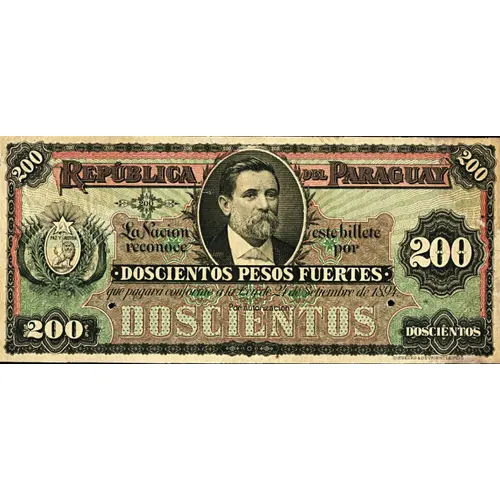 | Obverse lettering | REPÚBLICA DEL PARAGUAY La Nación reconoce este billete por DOSCIENTOS PESOS FUERTES 200 que pagará conforme á la Ley de 24 de Setiembre de 1894, por autorización. DOSCIENTOS (Translation: Republic of Paraguay The Nation recognizes this note for Two Hundred Pesos Fuertes That will pay according to the Law of September 24th., 1894 by authorization.) |