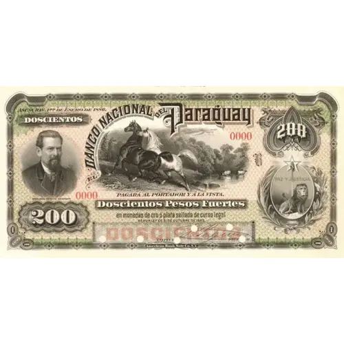 | Obverse lettering | ASUNCIÓN, 1ro. de Enero de 1886. EL BANCO NACIONAL DEL PARAGUAY PAGARÁ AL PORTADOR Y Á LA VISTA Doiscientos Pesos Fuertes en monedas de oro ó plata sellada de curso legal segun ley de 31 de Octubre 1883. (Translation: Asunción, January 1st., 1886 The National Bank of Paraguay Will pay to bearer, at sight, Two Hundred Pesos Fuertes in coins of gold or sealed silver, of legal tender, as Law from October 31st., 1883.) |