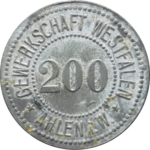 | Obverse lettering | GEWERKSCHAFT WESTFALEN 200 ★AHLEN i. W★ |