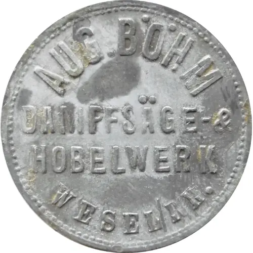 | Leyenda del anverso | AUG. BÖHM DAMPFSÄGE-& HOBELWERK WESEL/RH. |