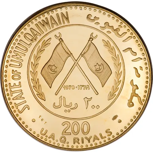 | Obverse lettering | · STATE OF UMULQAIWAIN حكومة ام القيوين · 1970 · ١٣٨٩ ٢٠٠ ريال 200 U.A.Q. RIYALS 181 [900] (Translation: State of Umm al-Quwain 1970 · 1389 200 Riyals 200 Umm al-Quwain Riyals 181 [900]) |