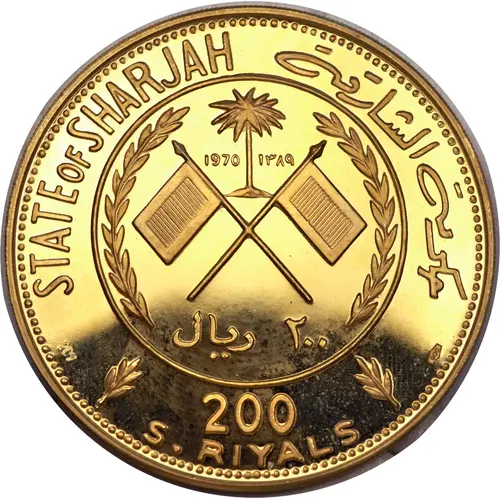 (Translation: State of Sharjah 1970 1389 200 Riyals 200 Sharjah Riyals [900] 207)