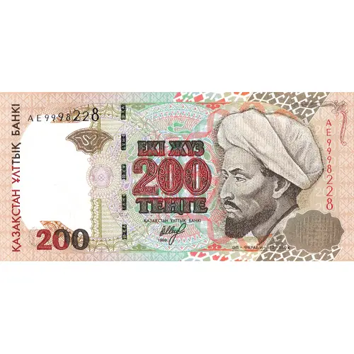 ҚАЗАҚСТАН ҰЛТТЫҚ БАНКІ ЕКІ ЖҮЗ 200 ТЕҢГЕ ҚАЗАҚСТАН ҰЛТТЫҚ БАНКІ 1999 ӘЛ - ФАРАБИ - 870 – 950ж (Translation: National Bank of Kazakhstan, Two Hundred Teñge, Äl-Farabï year 870-950) |