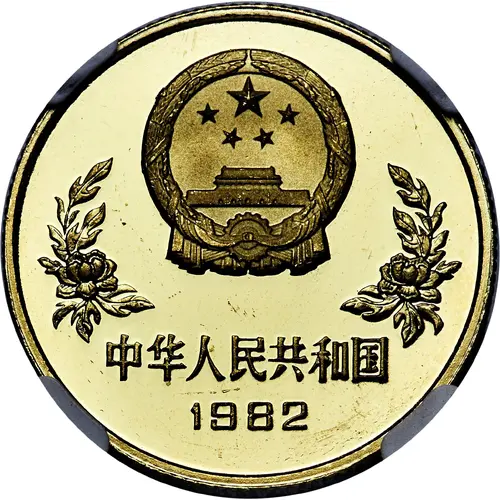 Coat of arms (20 September 1950) between mirrored plants with a flower above (state name) 中华人民共和国 (Zhōnghuá Rénmín Gònghéguó, translation: People`s Republic of China, bottom, year) 1982 |