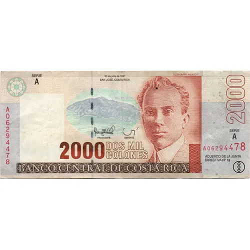 | Legenda do anverso | Clodomiro Picado T. 30 de julio de 1997 SAN JOSÉ, COSTA RICA ISLA DEL COCO 2000 DOS MIL COLONES ACUERDO DE LA JUNTA DIRECTIVA No. 13 BANCO CENTRAL DE COSTA RICA (Translation: Clodomiro Picado T. 30 July 1997 San José, Costa Rica 2000 Two Thousand Colones Board of Directors Accord No. 13 Central Bank of Costa Rica) |