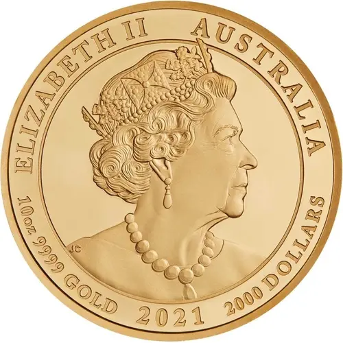 | Obverse lettering | ELIZABETH II AUSTRALIA 10oz 9999 GOLD 2021 2000 DOLLARS JC |