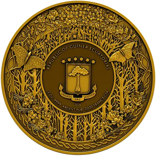REPUBLIC OF GUINEA ECUATORIAL UNIDAD PAZ JUSTICIA 2026 2 OZ 9999 ARGENT PUR 2000 FRANCS CFA (Translation: Republic of Equatorial Guinea Unity Peace Justice 2 ounces 999.9 pure silver) |